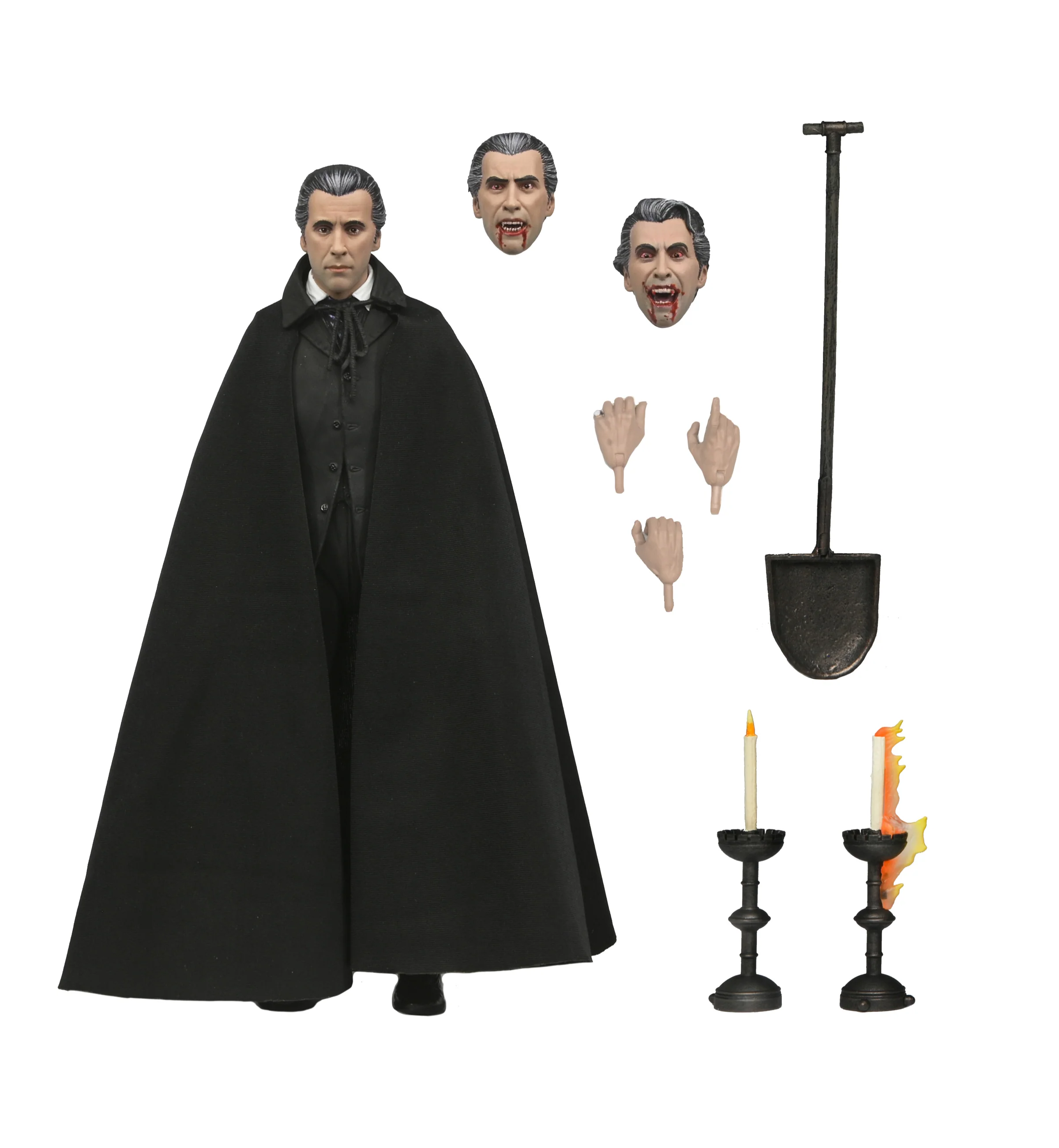 NECA presents the first in a series of action figures from the legendary Hammer House of Horror! Hammer has produced landmark horror since the 1950s, with one of its most famous being Horror of Dracula. The film captured audiences with its mix of vivid color, carnality, and violence, and Christopher Lee’s portrayal of Dracula is considered a benchmark against which other depictions are measured. This Ultimate Dracula action figure stands in 7” scale and includes removable fabric cape, interchangeable heads and hands, shovel, unlit candlestick, and fiery candlestick. Collector-friendly window box packaging with opening front flap.
