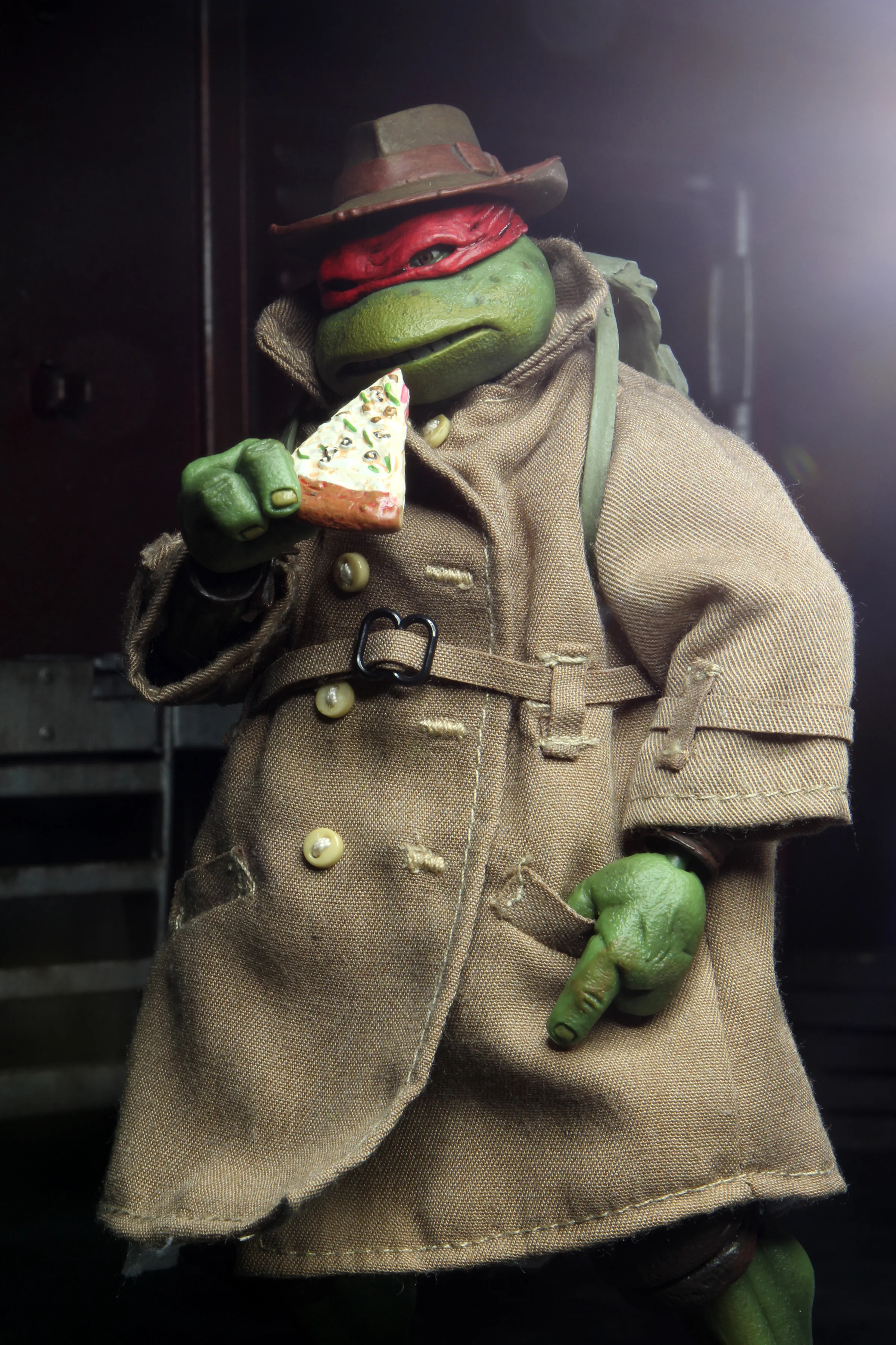 Raphael, a skilled sai-wielding ninja, comes with his signature weapons, alternate bandana knot, and a slice of pizza. Disguised in a fedora, backpack, and real fabric trench coat, he is able to roam the New York streets at night.